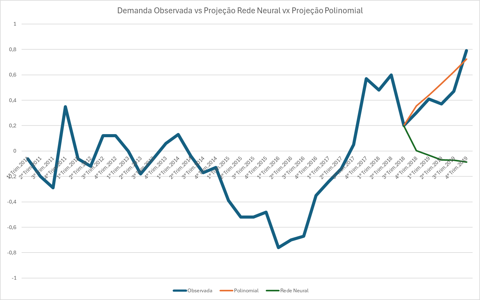 Efetivamente a projeção por redes neurais errou amplamente as previsões para os trimestres sob projeção em análise, tanto no sentido da tendência quanto na ausência de alocação das sazonalidades. A projeção polinomial, apesar dos maiores erros, foi a que mais se aproximou da demanda observada para o mesmo período, porém apenas plotando a tendência, sem percorrer as sazonalidades.