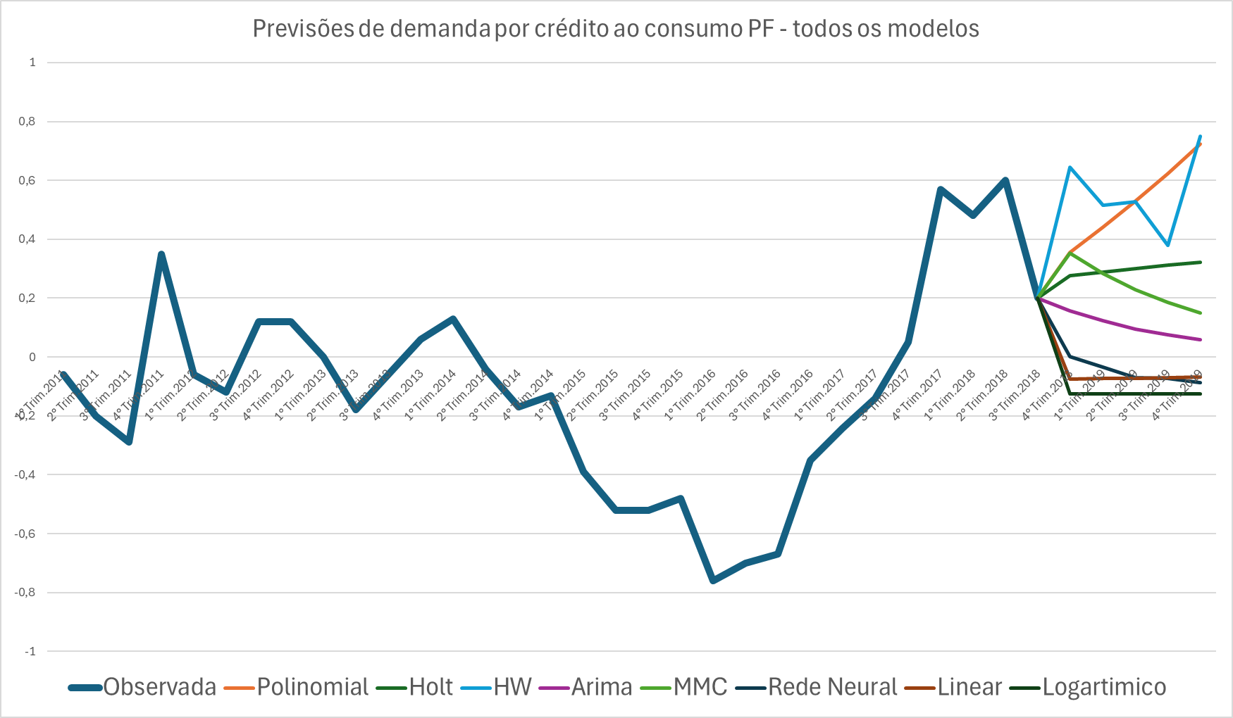 Portanto, fica evidente que analistas financeiros podem combinar as projeções qualitativas divulgadas pelo Banco Central com métricas quantitativas escolhidas em conformidade aos seus julgamentos pessoais, baseados em suas experiências com crédito. Todavia, o uso exclusivo de procedimentos quantitativos apoiados exclusivamente na acuracidade de seus erros, pode não ser o melhor caminho, frente às especificidades da série de demanda por crédito no Brasil - podendo sofrer variações mais ou menos drásticas em conformidade com políticas econômicas momentâneas, às volatilidades da taxa de juro básica da economia, às variações inflacionárias, dentre outros quesitos propícios a influenciar a demanda por crédito.